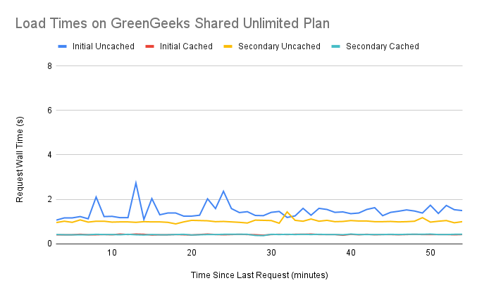 What I found was that DreamHost seems to keep my website warm as long as it’s been queried within 2 minutes. After 2 minutes, my website becomes cold and takes about 4 seconds to respond. In the ideal situation, my website is warm and cached which leads to consistent 0.2 second response times.